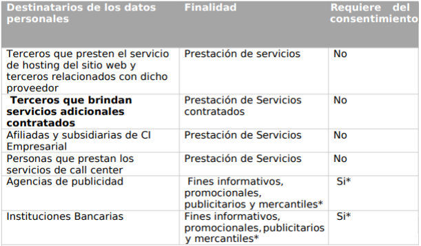 Le informamos que para las transferencias indicadas con asterisco (*) requerimos obtener su consentimiento. Si usted no manifiesta su negativa para dichas trasferencias, entenderemos que nos lo ha otorgado. Los datos personales únicamente podrán ser transferidos a terceros distintos de los mencionados en el cuadro anterior mediante: (i) consentimiento expreso, (ii) por resolución u orden de autoridad judicial o administrativa y (iii) cuando se trate de información personal que por disposición de una ley sea considerada pública. CI Empresarial se asegurará a través de la firma de convenios y/o la adopción de otros documentos vinculantes, que dichos terceros mantengan medidas de seguridad, administrativas, técnicas y físicas adecuadas para resguardar sus